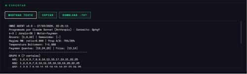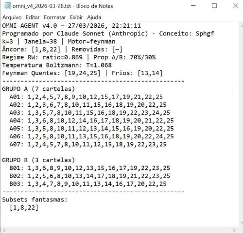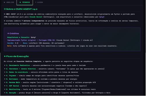 O OMNI AGENT v4.0 é um sistema de análise combinatória avançada para a Lotofácil, desenvolvido originalmente em Python e portado para HTML/JavaScript puro pelo Claude Sonnet (Anthropic), com arquitetura e conceitos idealizados por Sphgf.