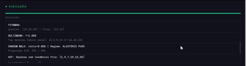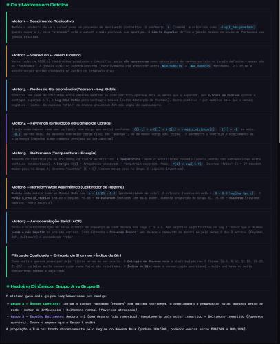 O sistema combina 7 motores independentes de previsão baseados em física estatística, teoria da informação e análise de séries temporais, com backtesting automático para eleger o motor de maior desempenho histórico.