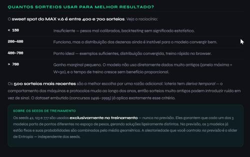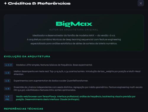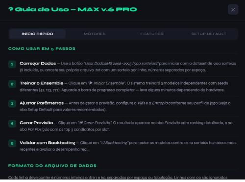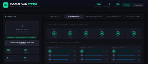 Anexada estão 2 versões, recomendo a leitura da ajuda no soft pra configurar e usar, deixei também um arquivo .json (max_v6_1776089715291.zip) já com o treinamento dos últimos 500 sorteios (até esta data, sorteios embutidos no script) .