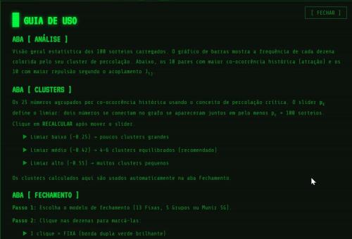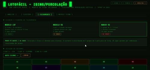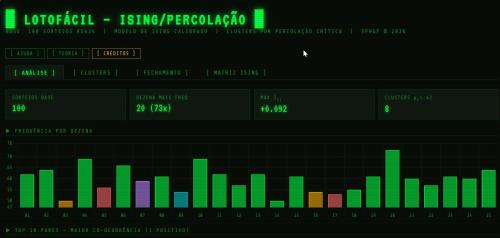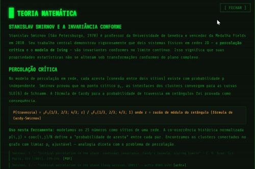 Uso nesta ferramenta: modelamos os 25 números como sítios de uma rede. A co-ocorrência histórica normalizada p(i,j) = cooc(i,j)/N define a "probabilidade de aresta" entre cada par. Encontramos os clusters conectados no grafo com limiar pc ajustável — analogia direta com o problema de percolação.